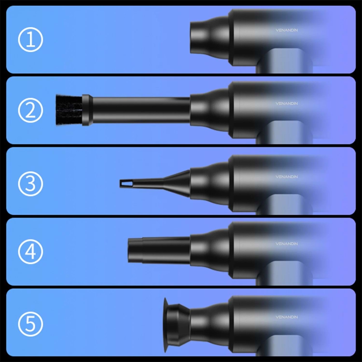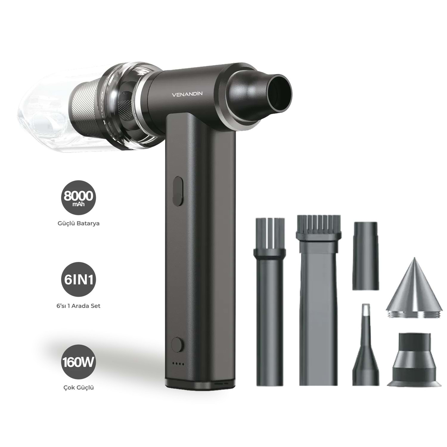 VENANDİN VCAVX-001 Airvex, üfleme ve emiş fonksiyonlarını tek cihazda birleştiren yüksek hızlı ve çok yönlü bir temizlik ve hava üfleme çözümüdür. Güçlü batarya yapısı ve yüksek devirli motoru sayesinde toz, kir ve hafif partiküllerin temizlenmesine yardımcı olur. Kademesiz hız ayarı ve farklı başlık seçenekleriyle ev, araç ve hassas yüzeylerde kontrollü kullanım sunan pratik ve taşınabilir bir cihazdır.