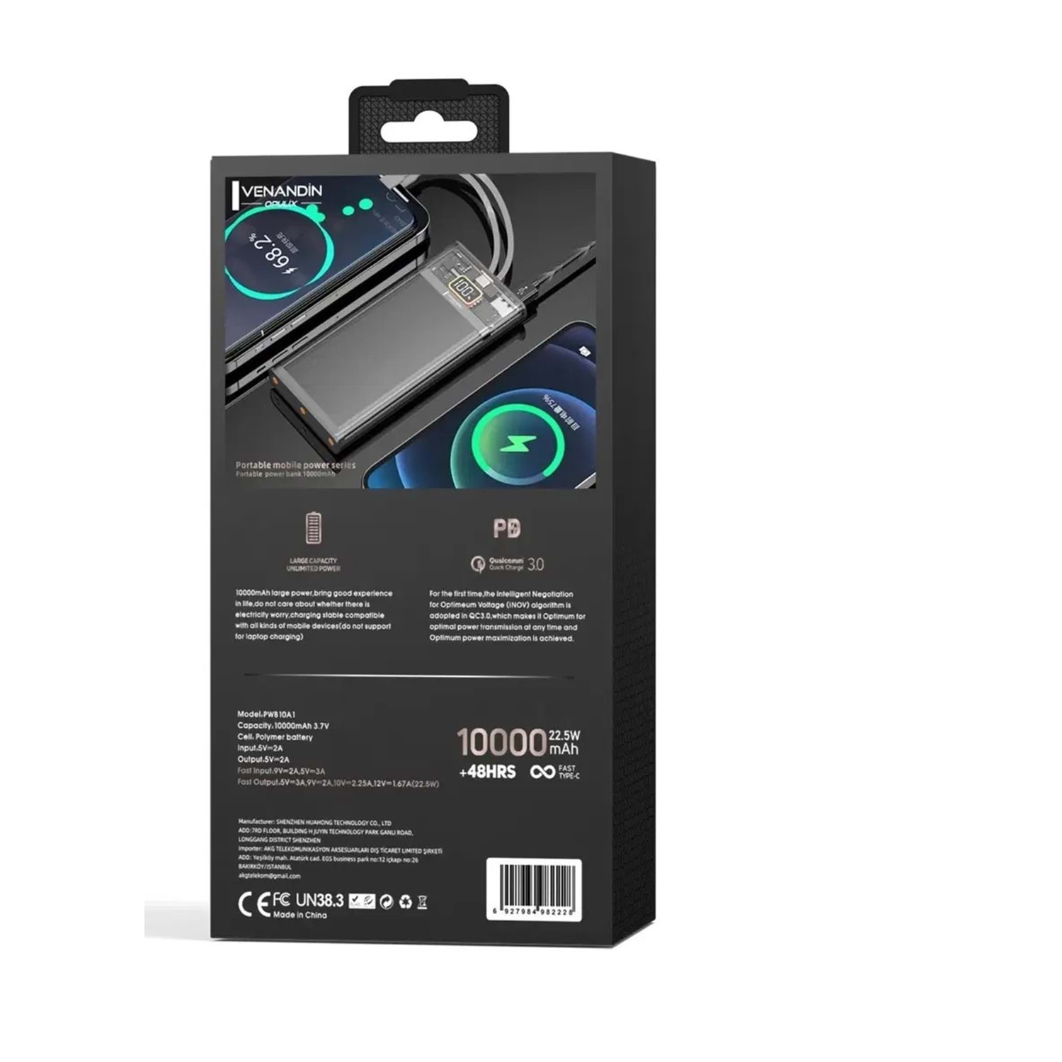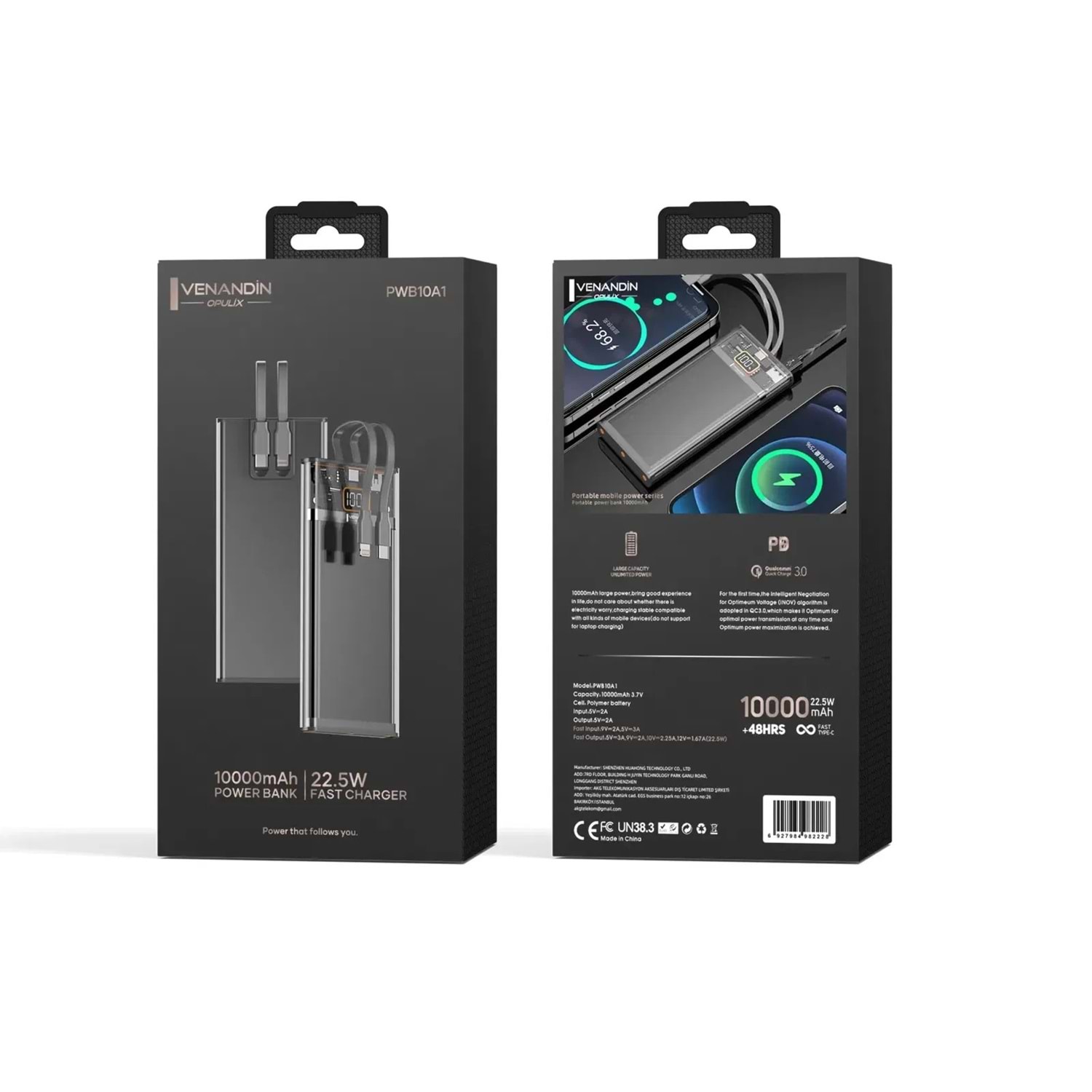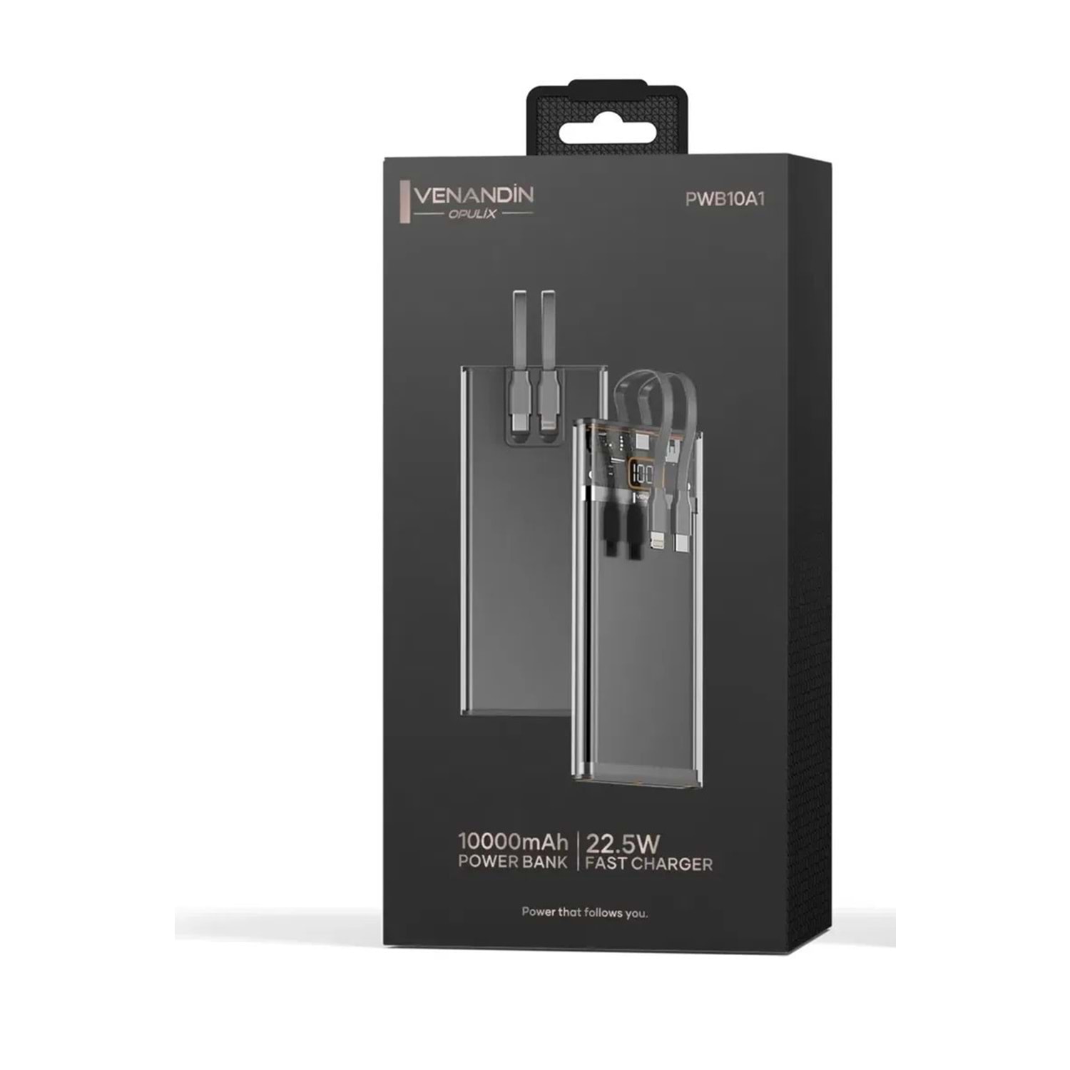Venandin PWB10A1 10.000 Mah Led Göstergeli 22.5w Hızlı Kendinden kablolu Powerbank