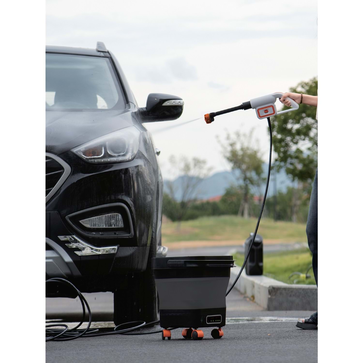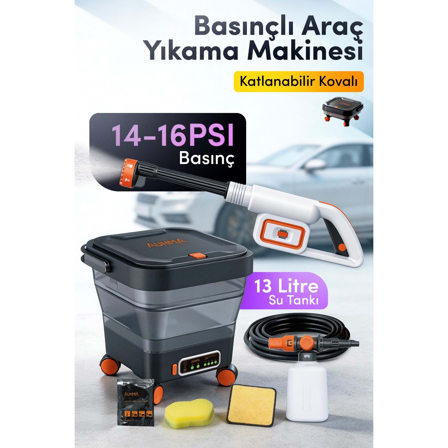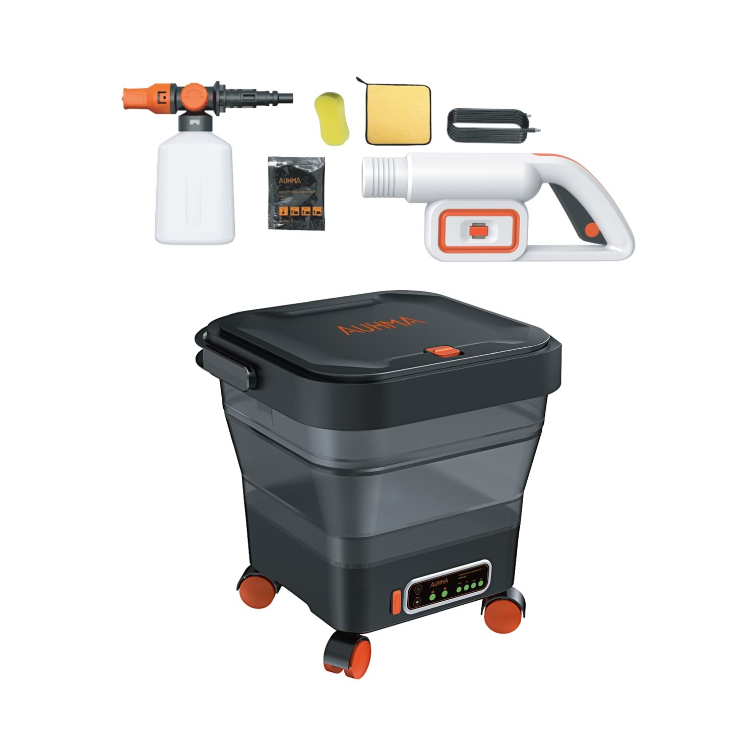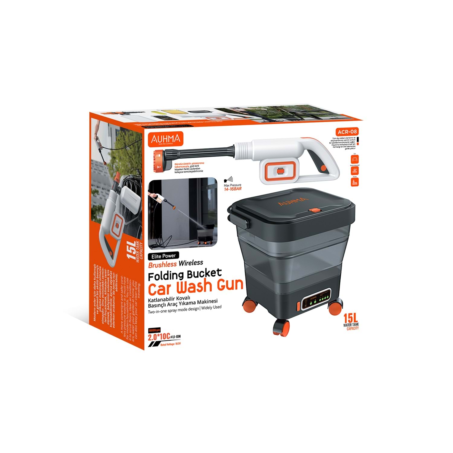 AUHMA ACR-08, su musluğu veya elektrik bağlantısı gerektirmeden aracınızı temizleyebileceğiniz taşınabilir bir şarjlı basınçlı yıkama makinesi setidir. Fırçasız motor teknolojisi ve 15 litrelik katlanabilir tekerlekli kovası sayesinde kamp alanında, otoparkta veya seyahatlerde aracınızı kolayca yıkayabilirsiniz.