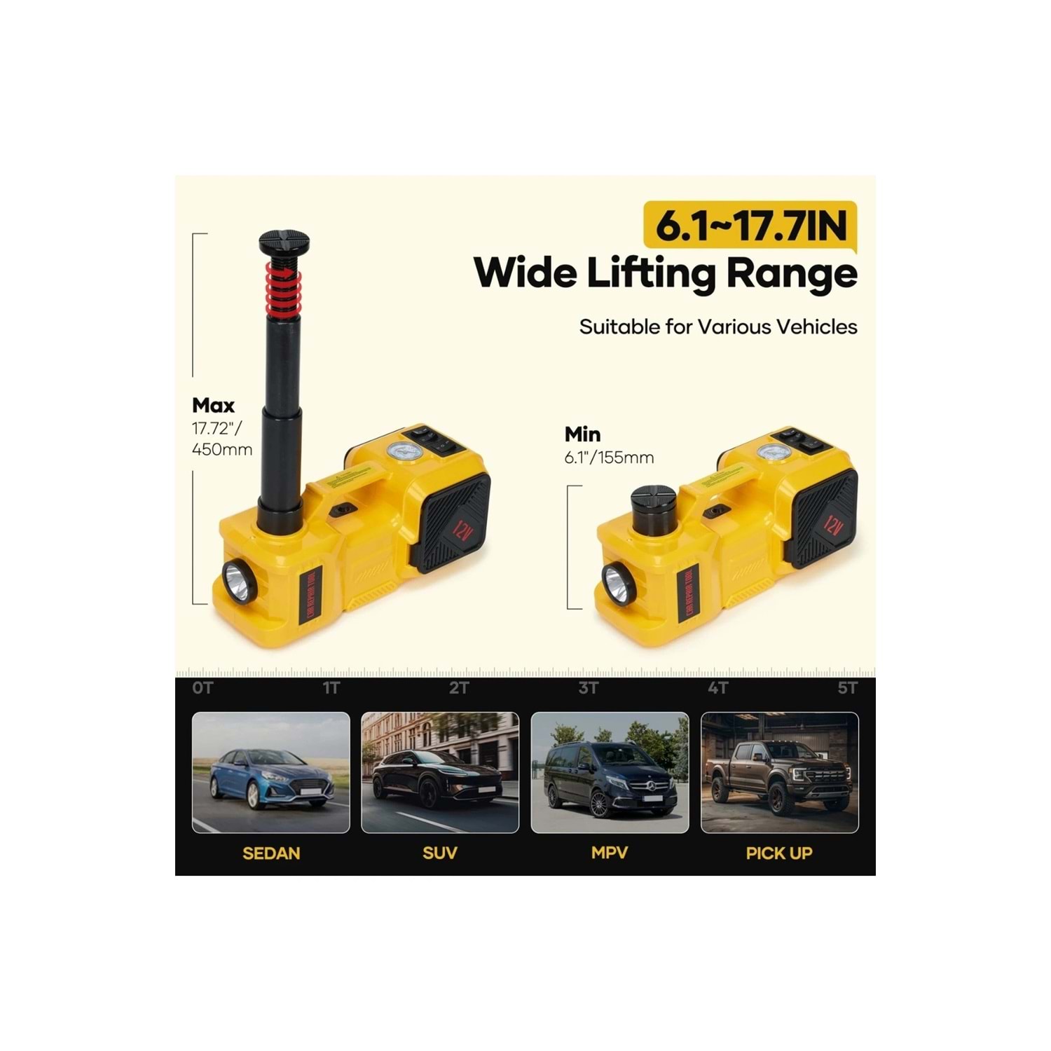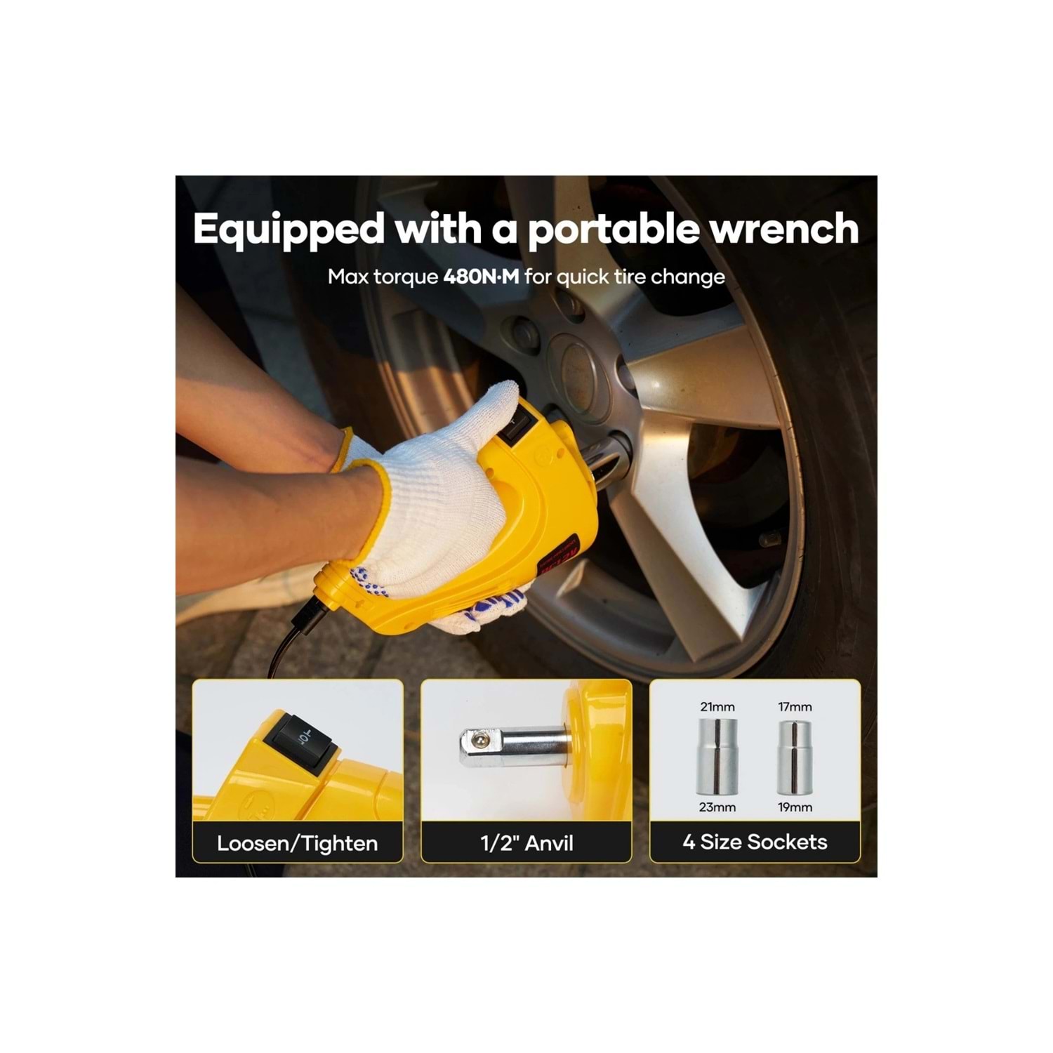 * 4 Fonksiyon Tek Cihazda: Elektrikli hidrolik kriko, güçlü darbeli bijon anahtarı, dijital lastik şişirme pompası (kompresör) ve gece görüşü için dahili LED aydınlatma.